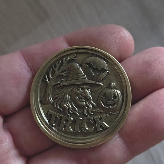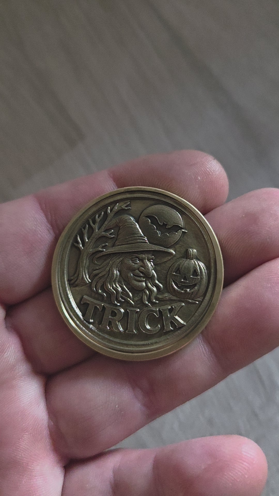 This Halloween-themed brass flip coin features an embossed witch design with the word "Trick" on one side, and a pumpkin motif accompanied by the word "Treat" on the other.