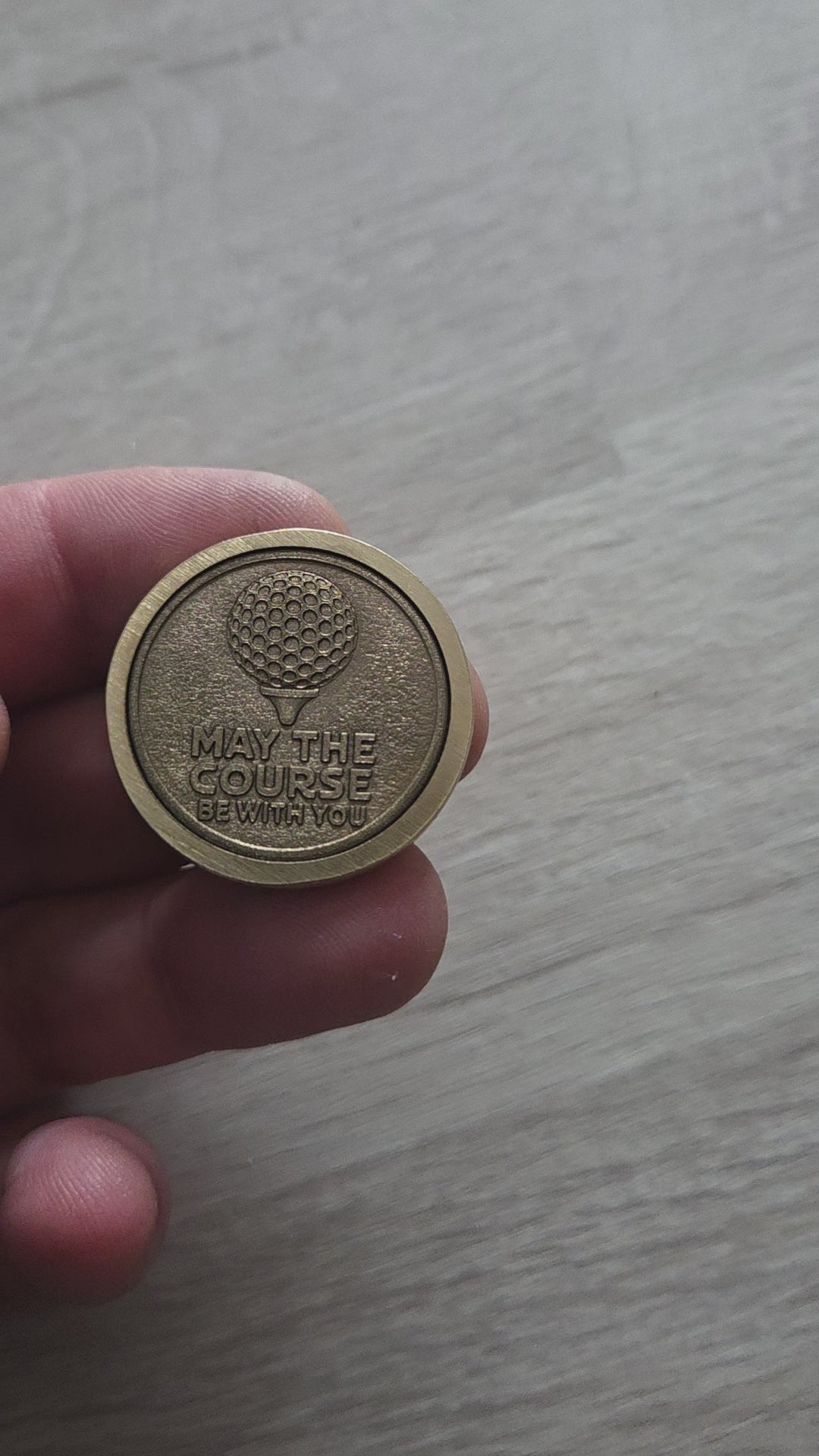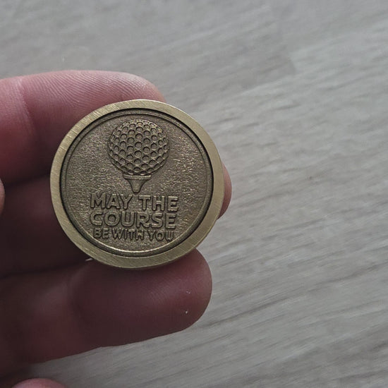 This 32 mm brass coin golf ball marker features a unique Star Wars-inspired design for enthusiasts of both golf and the iconic saga. One side displays a golf ball resting on a tee alongside the playful phrase "May the course be with you," blending sport and fandom perfectly. The reverse side showcases an adorable Baby Yoda illustration, adding character and charm. Crafted from durable brass, this marker offers reliability on the green while reflecting your passion for golf and Star Wars in expert style.