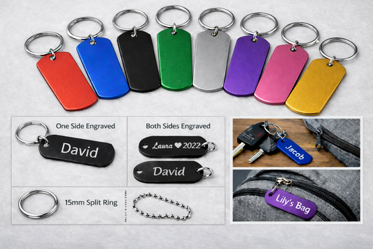 Engraved Aluminium Key Tags – Personalised Laser Etched Fobs, 9 Colours, Single or Double Sided
