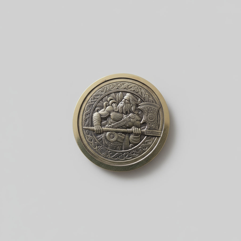 This 40mm solid brass coin features an expertly embossed image of a Viking wielding a large axe on one side, while the reverse is finished with a mirror polish. Crafted with precision, the coin’s highly polished surface exhibits minor marks consistent with its artisanal production, enhancing its authentic character. Perfect for collectors and history enthusiasts, this brass coin blends detailed craftsmanship with a robust, tactile feel.